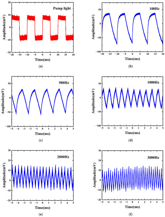 Waveforms of the signal light at different modulation frequencies. (a) Waveform of the pump light at 100 Hz. (b–f) Signal waveform at 100 Hz, 500 Hz, 1000 Hz, 2000 Hz, 3000 Hz.