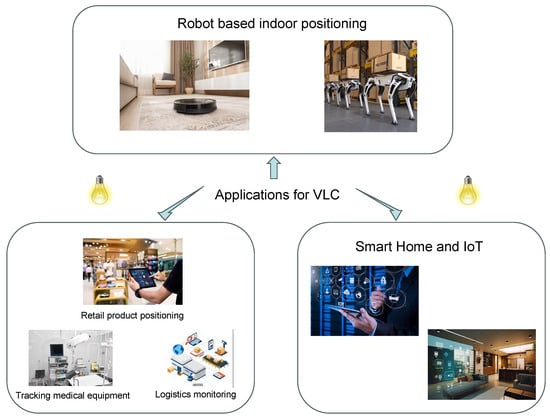 VLC-based IPSs have a wide range of applications, as shown in Figure 1. In retail, they can be used to enhance the customer experience by adding location-specific amenities and customized suggestions. In healthcare, VLC-based IPSs can be used to facilitate patient tracking and monitoring, thereby enhancing effectiveness and ensuring well-being. In industrial domains, these systems act as catalysts, enabling seamless asset monitoring and streamlining workflow management. In addition, VLC-based IPSs can be used in transportation networks to provide real-time passenger monitoring and seamless navigation. Taken together, these pioneering systems provide unprecedented indoor positioning accuracy and adaptability, enabling industries to optimize operational efficiency, enhance security, and deliver customized services.