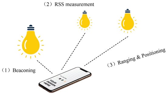 VLC-based IPSs benefit from breakthrough LED technology. For example, this article [] describes how to improve the performance of visible light communication (VLC) systems by optimizing the superlattice interlayers (SLs) of Si-based LEDs. By receiving information such as the position of transmitters and detecting the direction and intensity of the received light, the position of the receiver can be estimated. The position of transmitters is usually broadcast using VLC. The driving force behind VLC-based IPSs is the use of existing and future LED infrastructure, as well as the integration of state-of-the-art smart mobile devices equipped with light sensors (see, e.g., []). By leveraging these resources and developing sophisticated algorithms, novel indoor positioning systems can be created; see Figure 2 in reference [] for an illustrative example.