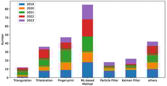 A hybrid algorithm is proposed by combining the utilization of RSS and AOA in []. If one technique fails or provides inaccurate results in a certain area, the system can rely on other techniques to ensure continuous and reliable positioning. However, it may be costly and complicated to implement and integrate these different technologies by adding additional hardware and software components.