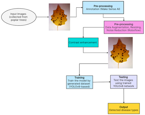 Our study introduces, as described in Figure 1, significant advancements in poplar disease detection through the development of a YOLOv8 model, supported by a newly compiled dataset. The key contributions include the following: