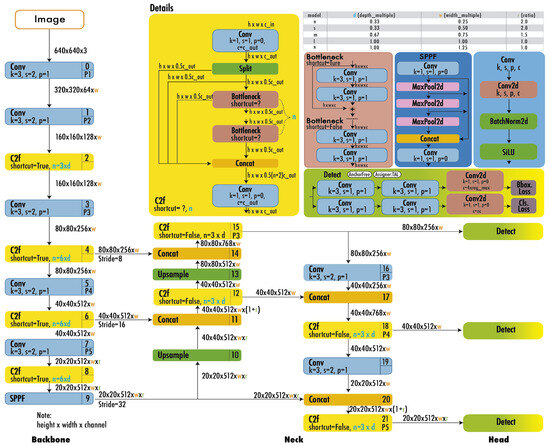Figure 5 illustrates the YOLOv8 architecture. The architecture uses a modified CSPDarknet53 backbone. The C2f module replaces the CSPLayer used in YOLOv5. A spatial pyramid pooling fast (SPPF) layer accelerates computation by pooling features into a fixed-size map. Each convolution has batch normalization and SiLU activation. The head is decoupled to process objectness, classification, and regression tasks independently.