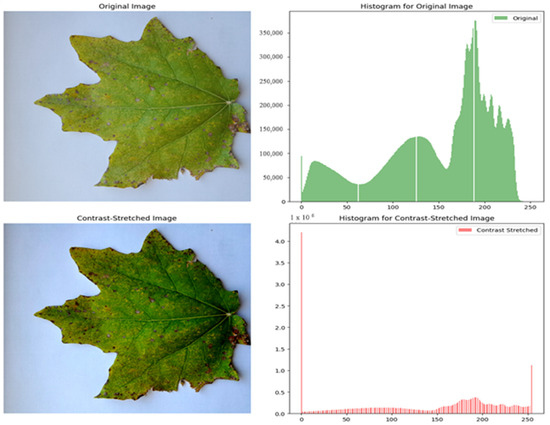 High humidity can lead to diminished image quality, affecting the detection system’s ability to perform accurately due to issues like low visibility, image blurring, and changes in leaf surface appearance. To counteract these challenges, we incorporated the Contrast Stretching technique [36] into our poplar disease detection model. Before the technique can be performed, it is necessary to specify the upper- and lower-pixel value limits over which the image is to be normalized. Often, these limits will just be the minimum and maximum pixel values that the image type concerned allows. For example, for 8-bit gray-level images, the lower and upper limits might be 0 and 255. Call the lower and the upper limits a and b, respectively. As shown in Figure 6, the simplest sort of normalization then scans the image to find the lowest and highest pixel values currently present in the image. Then, each pixel P is scaled using the following function: