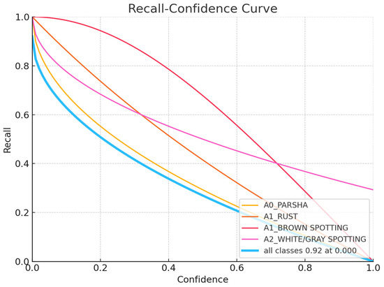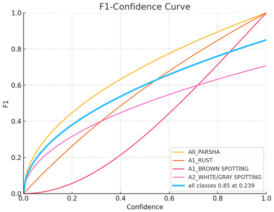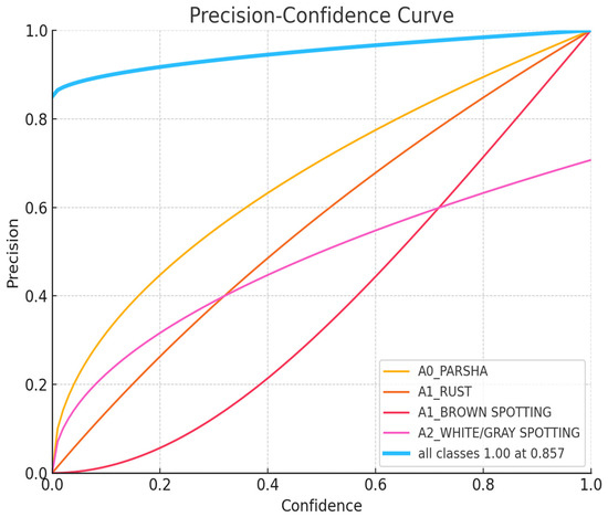 Figure 7 shows a Precision–Confidence Curve. It demonstrates that the model’s predictions are more reliable at higher confidence levels across all classes. A0_PARSHA and A1_RUST exhibit strong performance, even at moderate confidence levels, while A1_BROWN SPOTTING and A2_WHITE/GRAY SPOTTING show significant improvements in precision at higher confidence levels. The overall high precision at a confidence level of 0.857 suggests that the model is well calibrated and can be trusted for making high-confidence predictions.