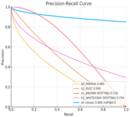 Figure 8 illustrates a Precision–Recall Curve. It describes the model’s ability to balance precision and recall for each class. A0_PARSHA and A1_RUST exhibit outstanding performance with high precision and recall values, as evidenced by their high AP scores. A1_BROWN SPOTTING and A2_WHITE/GRAY SPOTTING show more significant trade-offs, with lower precision at higher recall levels, indicating areas where the model could potentially improve. The high mAP of 0.866 for all classes suggests that the model performs well overall, maintaining a good balance between precision and recall across different classification tasks.