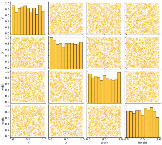 The plot includes four variables: x, y, width, and height. The diagonal plots show the distribution of each variable as a histogram or density plot. The off-diagonal plots are scatter plots showing the relationships between pairs of variables. For instance, the scatter plot between x and y is shown in the top-left corner. A scatter plot between width and height is in the bottom-right corner. Color and Density: The scatter plots use a blue color to represent data points, with darker areas indicating a higher density of points. Axes: Each scatter plot has its own set of x and y axes, labeled according to the variables being plotted.