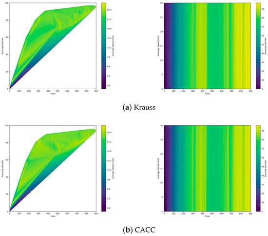 As shown in Figure 12, we generated a heat map to show the relationship between the average speed of different models and the volume of vehicles being driven on the road for a certain time at a density of 1400 vehicles per hour. This heat map helps visualize different models’ performance under high-density traffic conditions. In this case, the vehicles in motion data represent the remaining vehicles that have not yet reached the end of the trip, i.e., stranded vehicles.