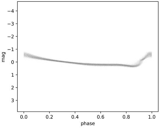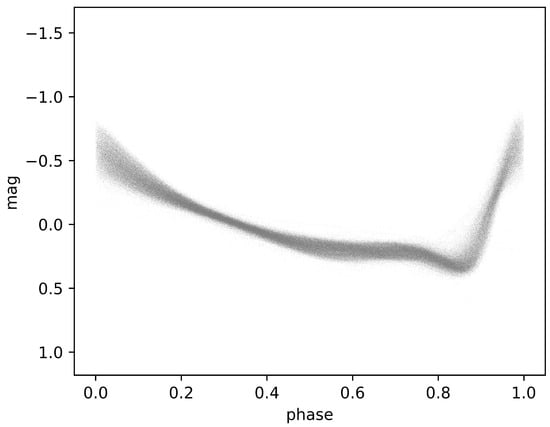 where T represents the observation time and denotes the epoch at the maximum light of the source during the pulsation cycle that is expressed in Barycentric Julian Day (BJD) for Gaia’s sources, and P is a pulsation period. As shown in Figure 1, following the application of the aforementioned method, our dataset for training deep-learning models is composed of 6002 G-band light curves of RR Lyrae stars.