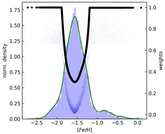 The distribution of metallicity of 6002 RRab stars in our dataset along with their respective sample weights is illustrated. Histograms are marked by blue bars, while kernel density estimates of the [Fe/H] values are represented by green curves. Black symbols denote the (normalized) weights derived from the inverse of the density. The final sample weights are denoted by blue points.