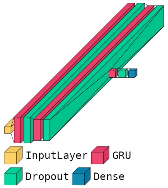 Figure 4 shows the schematic architecture of our best-performing predictive model, while its main parameters and hyperparameters are listed in Table 2. More in-depth, as already mentioned in Section 4.3.5, it contains three blocks based on GRU layers, utilizing L1 regularization on the recurrent regularizer parameters and L2 regularization on the kernel regularizer parameters. Additionally, dropout layers are employed after every GRU layer to prevent overfitting and enhance generalization. This architecture was specifically designed to balance complexity and performance, ensuring robust predictions while maintaining computational efficiency. The strategic placement of regularization and dropout layers effectively mitigates the risk of overfitting, contributing to the superior performance of our models on unseen data. The combination of these architectural choices and hyperparameter configurations enables our GRU-based model to capture temporal dependencies effectively, handle varying sequence lengths, and maintain stability during the training step.