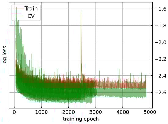 Training loss (red) versus validation loss (green) for each cross-validation fold (5). The plot illustrates the consistency between training and validation performance, indicating the model’s ability to generalize well.