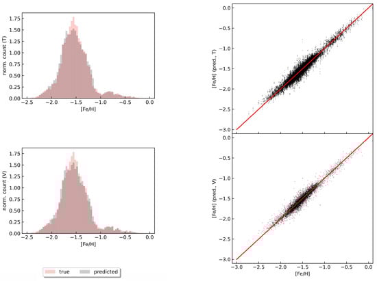 On the left side are presented histograms of the true (red) and predicted (gray) [Fe/H] values from our best G-band model for the training (T; top) and validation (V; bottom) datasets. On the right side are shown true vs. predicted photometric metallicities from the GRU predictive model. The top and bottom panels show the full training (4801 time-series) and validation datasets (1201 time-series), respectively. The red lines denote the identity function.