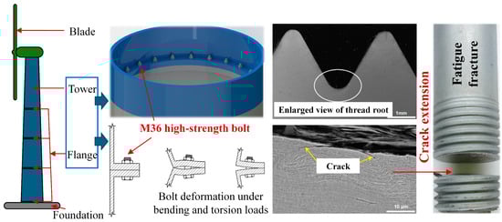 As shown in Figure 1, high-strength bolts are key connecting components of the wind turbine tower. These bolts are subjected to gravity loads, dynamic alternating air loads, and loads from the start–stop operations of the turbine over long periods. The thread roots of these high-strength bolts, which have significant axial pre-tightening force, are prone to stress concentration and the initiation of fatigue cracks. These cracks can lead to fatigue failure along the circumference of the bolts, potentially causing the tower to bend or even collapse, leading to major safety incidents. Therefore, to ensure the safety of equipment and personnel during the service period of wind turbines, it is necessary to regularly detect the fatigue damage of the tower bolts.