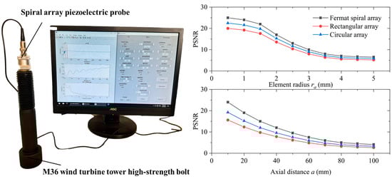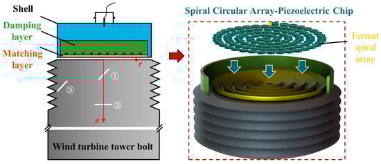 Furthermore, we found that longitudinal (L-mode) and transverse (S-mode) ultrasonic waves were more sensitive to lateral and longitudinal cracks, respectively. Therefore, future work will further validate the effectiveness of S and L mixed-mode ultrasonic waves in detecting multi-directional cracks in bolts, aiming to achieve rapid and accurate crack detection in various orientations. The computational complexity of the Fermat spiral array design and signal processing, potential challenges in manufacturing spiral arrays with very small element sizes, and the need for further investigation into optimal spiral coefficients for different bolt geometries and crack characteristics all represent significant areas of concern, which will be studied in our future works. Additionally, to ensure the long-term reliable operation of this detection system in the harsh working environment of wind turbines, factors such as system durability, calibration requirements, cost, and resistance to environmental factors need to be considered. Simplifying the calibration process, developing automated calibration software, and implementing online adaptive calibration techniques are important methods for reducing maintenance costs. Future research will explore the use of corrosion-resistant materials, waterproof and dustproof designs, and rigorous environmental testing to enhance system durability.