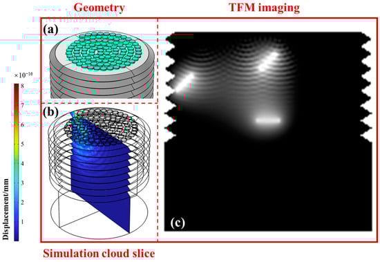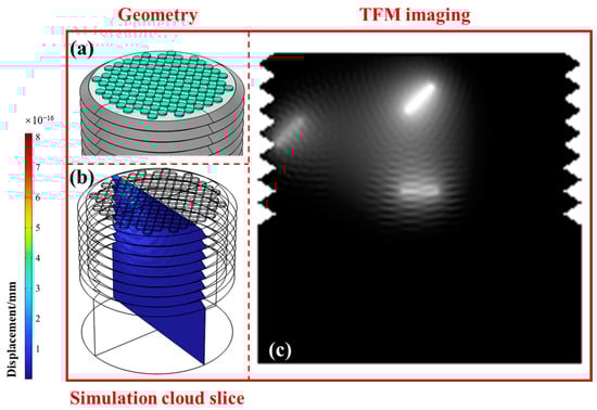 Additionally, due to the complex propagation directions of bolt cracks, using a single-mode ultrasonic detection method is less effective. Therefore, we adopted a multi-physics dynamic co-simulation method based on COMSOL-MATLAB-SolidWorks (COMSOL 6.1—MATLAB 2022—SolidWorks 2023). This method introduces impedance boundary conditions on the bolt surface and uses coupled solutions of the electromagnetic and solid mechanics modules to construct a three-dimensional general finite element model for the entire ultrasonic spiral phased array transceiver process of wind turbine tower bolts. This approach ultimately allowed us to obtain the coupling characteristics of ultrasonic transverse and longitudinal modes with fatigue cracks in different orientations. The simulation results are shown in Figure 6a–c, where the transmitting elements were upgraded to oblique wedges to excite different ultrasonic modes.