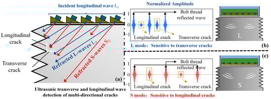 Interaction between S and L ultrasonic modes with longitudinal/lateral cracks, and the simulation signals of thread/crack reflections. (a) Schematic diagram of the interaction between different ultrasonic modes and crack defects; (b) Simulated defect detection signal for L-mode ultrasound; (c) Simulated defect detection signal for S-mode ultrasound.