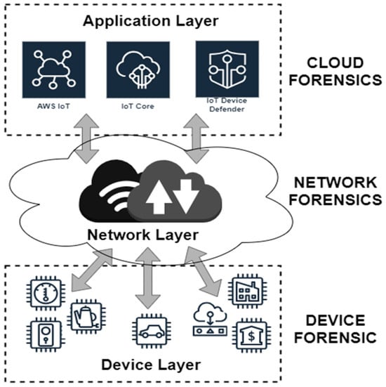 - Network Layer Forensics: The network layer of IoT comprises various networks connecting devices to each other and the internet, such as PANs, BANs, WANs, HANs, and LANs. Leveraging the logging and auditing capabilities of these networks can collect legally admissible evidence to trace users within the IoT ecosystem [10].