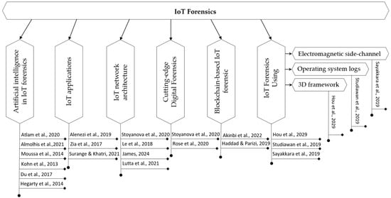 The Internet of Things (IoT) is a network of devices embedded with electronics, software, sensors, and connections, enabling data sharing and communication. It facilitates automation and cooperation across industries, such as healthcare, agriculture, transportation, and manufacturing [1]. However, security and compatibility issues, including insufficient protection, lack of standardisation, and hacking risks, must be addressed to fully realise the IoT’s potential and ensure privacy and data security [2,3]. Moreover, the expanding use of IoT devices in various aspects of life, including criminal activities, and the need to properly manage digital evidence in judicial procedures increase the demand for IoT forensics. IoT forensics involves the extraction, analysis, and preservation of digital evidence from IoT devices for legal proceedings or incident response [4]. Key areas in this field include extracting evidence from IoT devices, analysing network communications, developing specialised tools and methodologies, addressing challenges posed by the diversity of IoT devices, enhancing the reliability and consistency of forensic evidence, and standardising practices in IoT forensics.