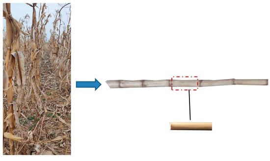 Natural air-dried maize straw harvested in Xujiazhuang Village, Zhoucun District, Zibo City, was used to make the experimental materials. As depicted in Figure 1, the variety was NK 815. During the experiment, 10 stalks were randomly selected, and the leaf sheaths, bracts, and roots of the corn stalks were removed. The third section of maize straw from the ground was selected. As shown in Table 1, the length and diameter of the maize straw were 90 ± 4.92 mm and 23.78 ± 3.21 mm, respectively. The average moisture content of the maize straw was 8.34%. All the maize straw was transferred into a measuring cylinder, and the volume of discharged water indicated the volume of the maize straw. The quality of the maize straw was measured with a balance. The density was 136.4 kg/m3.