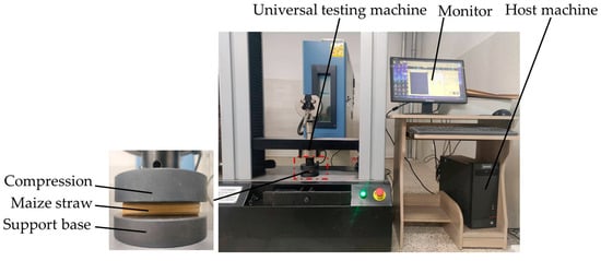 A radial compression test of the maize straw was conducted using a universal testing machine, as shown in Figure 2. A corn straw with a length of 90 mm was selected and placed horizontally in the center of the support base. The experimental loading speed was 20 mm/min. The experiment was stopped after the maize straw was visibly crushed. After repeating the process 10 times, the peak compression force of the maize straw was 1798 N.