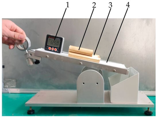 The static friction coefficients of the maize straw–maize straw and the maize straw–steel plate were measured with an inclined-plane instrument [23]. Before the experiment, the maize straws were neatly and tightly bonded together to form a straw bottom plate. Each plate was placed on the inclined-plane instrument on a horizontal test bench and stuck to the testing plane of the inclined-plane tester. The angle of the test plane was adjusted until the maize straw was observed to slide. The angle on the digital display inclinometer was recorded, as shown in Figure 3. The static friction coefficient between the maize stalks was calculated using Equation (1). Each group of tests was repeated 10 times, taking the average value as the final value. The static friction coefficients of the maize straw–maize straw and the maize straw–steel plate were 0.28 ± 0.05 and 0.45 ± 0.08, respectively.