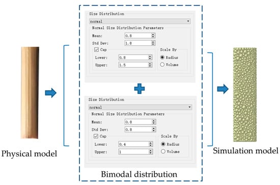 where is the contact area between particles (mm2); is the normal force acting on the particles (N); is the tangential force acting on the particles (N); is the normal moment of the particle (N∙m); is the tangential moment of the particles (N∙m); is the normal bonding stiffness (N/m3); is the tangential bonding stiffness (N/m3); is the normal velocity of particle motion (m/s); is the tangential velocity of the particles (m/s); is the normal relative velocity of the particles (rad/s); is the tangential relative velocity of the particles (rad/s); is the time step size (s); is the moment of inertia of the particles (kg∙m2); and is the contact radius of the particles (mm).