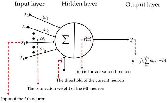 The BP (backpropagation) neural network is a multi-layer feedforward neural network trained using the error backpropagation algorithm, mainly composed of three layers: the input layer, hidden layer, and output layer [35,36]. Neurons connect each layer to another, transmitting information between them. The gradient descent method adjusts the weight and threshold of the neural network via error backpropagation to minimize the network error. As shown in Figure 6, the input (xn) of each neuron is multiplied by their respective weights (ωn) and then subtracted from the bias vector (b). The sum of the inputs is passed through an activation function to obtain a specific neuron output (y).