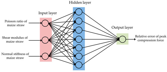 Some researchers have carried out multiple studies on the calibration of the simulation parameters of agricultural materials. It is necessary to calibrate the relevant input parameters to establish an accurate discrete element parameter model and obtain a better direct interaction relationship between the material and the contact material [7,8,9]. Ma et al. [10] established a calibration model of mixed parameters for red clover seed and coated powder using the JCR model and verified the accuracy of the model parameters via experiments. Zhang et al. [11] constructed a calibration model for the mixed parameters of a maize root system and soil, providing a reference for the discrete element simulation of maize no-tillage operations. Jung et al. [12] established a simulation model for the flow parameters of soybeans with different pore sizes and water content and predicted the flow performance of soybeans with different water content via experiments. Zhang et al. [13] analyzed the relationship between different structures and bonding parameters of banana straw and established a high-precision discrete element model of banana straw. Zhao et al. [14] established a discrete element model of cotton straw compression and experimentally verified that the established model could accurately simulate the compression process of cotton straw. Tang et al. [15] studied the mechanical properties of rice straws of different lengths under vibration and non-vibration compression conditions, providing basic data for the development of straw compression machinery. Shi et al. [16] established a discrete element model of a wheat straw monomer and conducted physical and simulation experiments on the properties of wheat straw, such as tensile strength, compression, three-point bending, and shear stress. Zheng et al. [17] carried out discrete element parameter calibration for the cutting process of corn stalks. Traditional machine learning models require numerous datasets to be analyzed to obtain satisfactory results. The backpropagation (BP) neural network model can use less data to build the model [18,19]. Many scholars have studied the genetic algorithm (GA)–BP algorithm. Li et al. [20] compared the photovoltaic power generation prediction model constructed using three neural network algorithms, BP, GA–BP, and PSO (particle swarm optimization)–BP (backpropagation), and improved the prediction accuracy of photovoltaic power generation. Wei et al. [21] effectively predicted tool wear based on a GA–BP neural network model. Liu D et al. [22] compared the accuracy of the BP and GA–BP neural network models for soil water prediction. The test results showed that the GA–BP model could be used to predict soil water for ecological protection. However, the simulation parameters for maize straw calibration using a combination of the discrete element method, physical experiments, and machine learning have not been consulted.