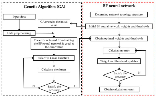 The genetic algorithm was used to optimize the initial weight and threshold of the BP neural network model, improve its computational efficiency and prediction accuracy, and build the collaborative mechanism of the genetic algorithm and BP neural network model. The GA–BP neural network is a hybrid algorithm combining the genetic algorithm and error backpropagation algorithm to train a feedforward artificial neural network, which can accelerate the convergence speed and avoid local minimization. This network converges quickly and easily reaches the optimal solution. The process of the GA–BP optimization algorithm involved using the genetic algorithm to optimize the initial weights and thresholds of the BP network before executing the BP algorithm. After genetic completion, the optimized initial weights and thresholds were assigned to the BP neural network for updating learning so that the optimized BP neural network could better predict the output of the function, as shown in Figure 8.