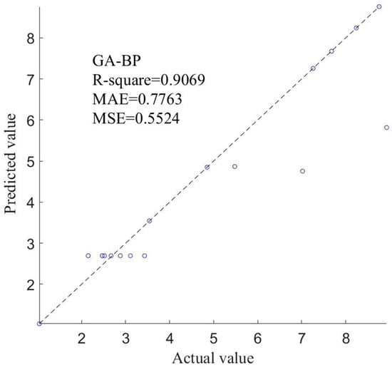 The change law of the measured and predicted values of the GA–BP is shown in Figure 9. The evaluation index R2 was 0.9069, the RMSE was 0.5524, and the MAE was 0.7763, which showed a good performance in model accuracy, stability, and fitting. This shows that the GA–BP algorithm achieved a better fitting effect in this study and constructed the model with higher precision and less error. This model could be used for further analysis.