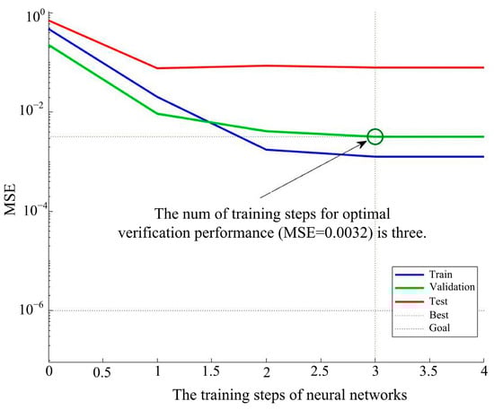 The MSE performance evaluation of the GA–BP algorithm model was carried out, as shown in Figure 10. The MSE of the model showed a decreasing trend during the training process. The fitting effect of the model to the training data gradually improved as the training progressed. The best performance was obtained at the third step of training, which indicates that the GA–BP model’s training convergence is fast and stable.
