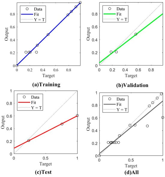 The training, validation, testing, and comprehensive performance changes of the GA–BP are shown in Figure 11. The correlation coefficients for the training, validation, testing, and comprehensive data were 0.9930, 0.9994, 0.9989, and 0.9386. This indicates that the model had a strong fitting effect and good generalization ability. The correlation coefficients of the data were very close, indicating no obvious overfitting or underfitting. The GA–BP algorithm was used to obtain a model with high precision and strong generalization ability, which could be used for subsequent experimental research.