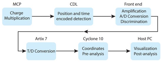 One of the most utilized architectures, especially when sensitivity to single particles (e.g., photons, electrons, and ions) and 2D information are required, involves using a charge multiplier, typically a microchannel plate (MCP), followed by a charge pulse detector. This setup provides spatial and temporal information about the particle’s impact point on the MCP [].