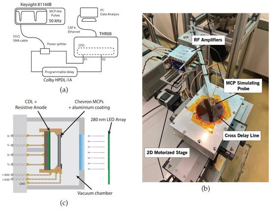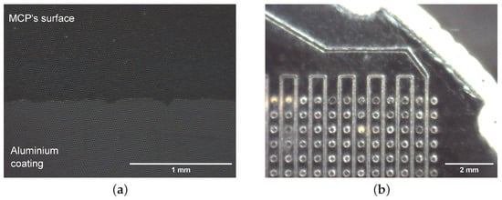 To detect the signal generated by a single particle while preserving both spatial and temporal information, a F1217-011 MCP (Hamamatsu Photonics, Shizuoka Prefecture, Japan) is used. A bidimensional 280 nm LED array illuminates the entire area of the MCP homogeneously. Subsequently, to measure the spatial resolution of the detector, a patterned aluminum mask, visible in the lower half of Figure 2a, is deposited via chemical vapor deposition directly onto the MCP’s surface.