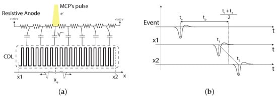 Other techniques capable of exploiting event centroiding based on charge division encoding offer a suitable alternative when time measurement is required. Such techniques include multi-anode or pixelated readouts. For the first one, cross strip (XS) anodes [,] are among the most recent detection techniques for spatially resolved single-particle detectors. With an additional TDC, temporal information can be measured (still using an additional TDC) either at the anode itself or at the MCP’s electrode, with the latter providing resolution comparable to the CDL approach. Pixelated readouts, on the other hand, enable simultaneous measurement of multiple events, drastically increasing the global count rate. Furthermore, recent developments in this technology allow the achievement of temporal precision just below 200 ps r.m.s. for each pixel []. Although comparable with CDL detectors in terms of resolution, both of these approaches are limited to a specific set of measurements. In contrast, a system that relies on time encoding (TDC) can adapt to different experiments, ranging from pump–probe spectroscopy to more complex coincidence measurements, without the need for additional hardware.