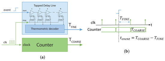 The propagation delay of the buffers making up the delay line determines the resolution of TDC in this design. Accordingly, the performance of this fundamental architecture would be unacceptably poor due to two factors: first, it is constrained by the propagation delays of the FPGA device’s bins (tens of picoseconds for the 28-nm), and second, by the variations in the propagation times through the various buffers (up to three or four times the mean propagation delay), which are also caused by the layout of those buffers []. These inescapable structural issues of the device have an adverse effect on resolution and linearity, which calls for the use of specialized sub-interpolation and calibration procedures []. More specifically, the calibration enables the device to regain outstanding linearity while the sub-interpolation makes up for the lack of native resolution (reaching an LSB of units of picoseconds for the 28-nm). The installed TDL-TDC may additionally achieve a dynamic range extended to over ten seconds due to the Nutt-Interpolation approach [], which works in concert with a digital counter to increase the FSR. The “stop” of the TDL-TDC is connected to a clock that likewise powers the digital counter, as seen in Figure 4a. By combining a fine measurement (), made by the TDL-TDC, which can be viewed as the time interval between the instant itself and the clock, and a coarse measurement (), provided by the counter as the counter value itself, it is possible to visualize how the measurement of the instant of occurrence of an event (“start” of the TDL-TDC in Figure 4b) can be understood.