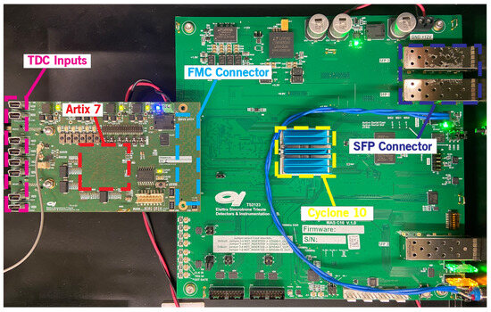 It is important to consider that the performance metrics of a FPGA-TDC are highly dependent on the routing of signals within the core fabric []. Moreover, the strict timing constraints imposed on the TDC-FPGA to reach optimal precision and linearity severely increase the compile time. Consequently, any modification to the design, such as the introduction of the processing, could potentially degrade performance and dramatically slow down the compilation process. However, by separating logically independent tasks—such as time-to-digital conversion and data processing—between two FPGAs, a modular strategy can be employed. This approach mitigates potential issues that may arise when altering the data-processing datapath. Furthermore, this strategy facilitates the replacement of individual components, whether by incorporating a different FPGA or by implementing the TDC on an ASIC.