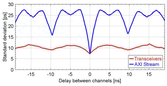 The temporal precision of the TDC was measured using both the AXI-bus and the transceiver-based communication interfaces, as described in the Measurement section. A comparison between the measurements is shown in Figure 7. As illustrated, the transceiver-based interface significantly improves precision. Specifically, the mean standard deviation measured over a delay span of ±19 ns with this interface is slightly higher than 10 ps, whereas the one measured with the parallel bus interface exceeds 20 ps. Moreover, the precision of the parallel bus interface exhibits periodic peaks with a period of 5 ns. These peaks originate from crosstalk between the 100 MHz clock of the interface and the TDL lines inside the FPGA-TDC. Although different routing could potentially reduce interference, this aspect was not further investigated as it is outside the scope of this work. Instead, by taking advantage of the high-speed communication blocks already embedded in the FPGA’s core fabric, the clock interference was drastically reduced, optimizing the throughput at the same time.