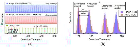 The second test was conducted to compare the system based on FPGA-TDC with a system that uses a commercial ASIC (TDC-GPX, ACAM, Stutensee-Blankenloch, Germany) [] instead of the FPGA, in the case of a time-resolved pump and probe experiment performed at the BACH beamline of IOM-CNR at the Elettra synchrotron facility (Trieste, Italy) [,].