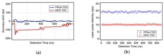 (a) Comparison of the accuracy of the TDC implemented on FPGA (blue) and on ASIC (red). (b) Comparison of the integrated intensities of laser pulses in counts per second measured under the same experimental conditions.