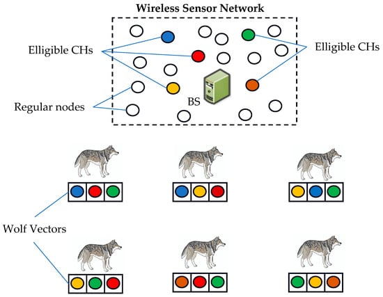 Before the start of each iteration in Algorithm 2, every node transmits its remaining energy to the BS. Upon receiving the energy levels from all nodes, the BS calculates ARE and selects nodes with a probability higher than to become candidate CHs. The BS then implements our proposed EOAMRCL approach, forming a set of wolf vectors from the group of nodes with a probability above . These wolf vectors consist solely of nodes eligible to be CHs, as shown in Figure 5.