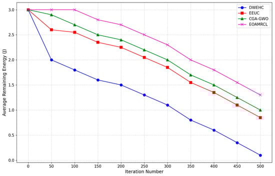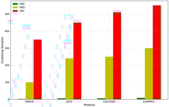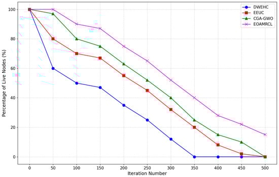 In contrast, the EOAMRCL protocol that implements GWO shows the best performance among the four protocols. The number of live nodes begins to decrease after about 100 iterations, similar to the other protocols, but the rate of decline is much slower. Even at 500 iterations, EOAMRCL manages to retain a significant number of live nodes, highlighting its superior capability in preserving node energy and maintaining network functionality over an extended period.