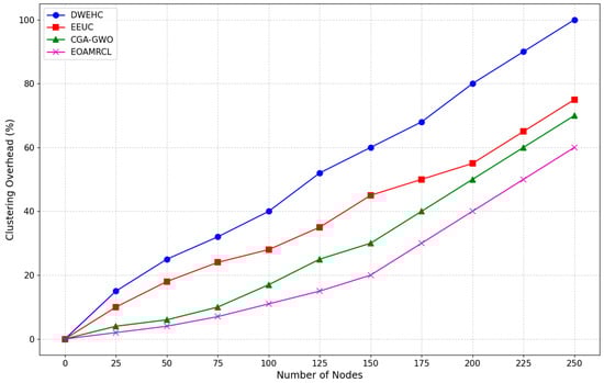 EOAMRCL exhibits the lowest clustering overhead among all the protocols. The increase in overhead is the most gradual, remaining well below 50% at 225 nodes. This superior performance can be attributed to EOAMRCL’s effective cross-layer optimization approach, which integrates the MAC and network layers to enhance energy efficiency and reduce communication costs. By leveraging GWO for optimal cluster head selection and routing and incorporating duty-cycle scheduling to alternate nodes between active and sleep modes, EOAMRCL minimizes the clustering overhead. This efficient management of network resources ensures that the protocol can scale effectively with the number of nodes without incurring excessive overhead.