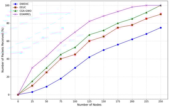 EOAMRCL demonstrates the best performance among all protocols, maintaining the highest percentage of packets received throughout the range of node counts. The increase is the most rapid, with over 90% of packets received by 175 nodes. This superior performance can be attributed to EOAMRCL’s effective cross-layer optimization approach, which integrates the MAC and network layers for enhanced energy efficiency and data transmission. By leveraging GWO for optimal cluster head selection and routing and incorporating duty-cycle scheduling to alternate nodes between active and sleep modes, EOAMRCL minimizes packet loss and maximizes successful data delivery. This efficient management of data transmission ensures that the protocol can handle increasing network sizes without compromising performance.