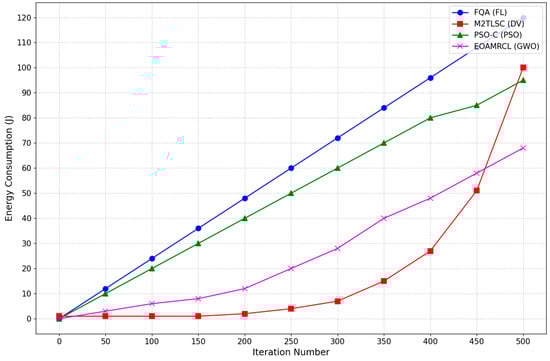 The M2TLSC protocol exhibits a moderate energy consumption pattern. Initially, at the 50th iteration, it consumes roughly 5 joules, doubling to about 40 joules by the 500th iteration. Although it performs better than FQA in terms of energy efficiency, its energy consumption trajectory indicates a steady increase, making it less suitable for applications requiring long-term deployment of sensor nodes.