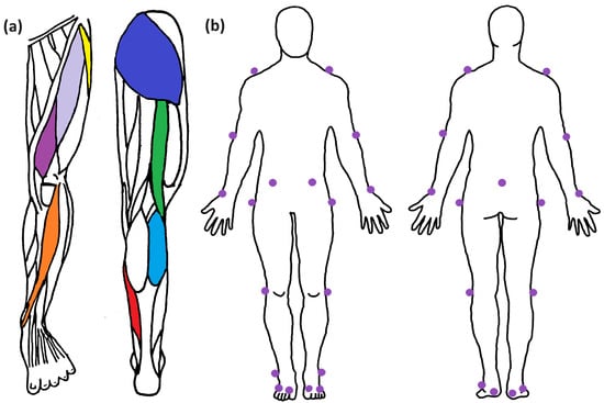 Overview of the sensor and marker placements. (a) Shows the leg muscles considered in this experiment. Sensors were placed on the tensor fasciae latae (yellow), rectus femoris (light purple), vastus medialis (dark purple), tibialis anterior (orange), gluteus maximus (dark blue), biceps femoris (green), gastrocnemius lateralis (light blue), and soleus (red). (b) Denotes the placements of the passive markers for the motion capture system. A custom-made reduced markerset was used to extract the necessary kinematic data while keeping an efficient experimental protocol. No marker was placed on the C7 chord since its visibility would be mostly blocked by the VR set. Markers are represented by purple dots.