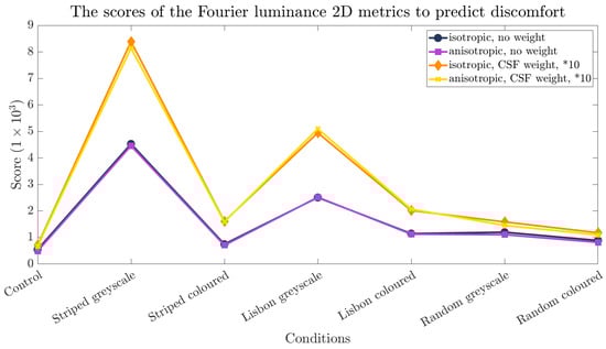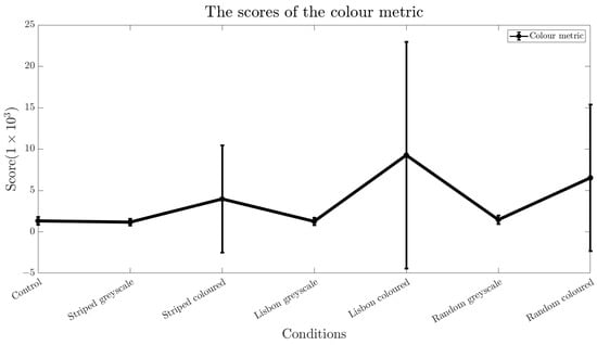 As expected, the Fourier-based metrics [40] yield the lowest (and, therefore, the best) scores for the control condition (see Figure 3). All versions of the metric punish a high-contrast environment. These results of the algorithm indicate that the striped pattern in greyscale is the worst pattern-colour combination in this experiment.