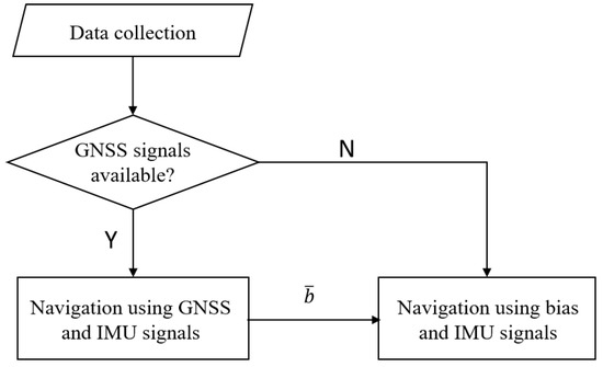 In what follows, we propose a switched approach to compute : the estimation is performed in two different ways depending on whether the GNSS signals are available or not. In the case where the GNSS signals are available (i.e., we perform navigation using GNSS signals), we exploit the GNSS and IMU data to estimate and the bias on accelerometers. In order to obtain a robust estimate of the bias, we compute its average over a time window of length N, and the latter is denoted by [m/s2]. In the case where the GNSS signals are unavailable (i.e., we perform navigation without GNSS signals), the estimated average bias, computed when the GNSS signals were available, is used to denoise the signals obtained from the accelerometers. Using the “denoised” IMU data, we compute an accurate estimate of . The switched scheme we propose is illustrated in Figure 1.