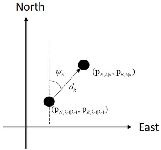 Consider a pedestrian having a smartphone equipped with both the exteroceptive sensor (GNSS) and the proprioceptive sensor (IMU), which comprises an accelerometer and a rate gyro. We aim to address the following 2D pedestrian navigation problem: let [m] denote the position of the pedestrian relative to the east–north–up coordinates system (ENU-system) at time k; given the available data at time k from the smartphone sensors (i.e., GNSS and IMU), we want to compute an estimate, say [m], of .