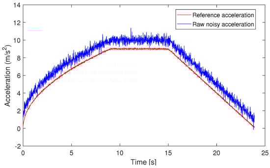 We generate the IMU and GNSS measurements as follows. For simplicity, we only consider the case where the acceleration is different from 0 only on the Y-axis, i.e., it is equal to 0 on the other two axes. We generate the one-dimensional reference acceleration in the L-system as in Figure 3 (red line); the corresponding sampling time is s. This reference describes a situation in which the pedestrian starts to run and then stops. In order to verify the goodness of the estimated average bias on the position estimation, we consider the idealistic setup where the gyro measurements are generated following a Gaussian distribution with zero mean and a small covariance matrix . Then, we generate the corresponding positions in the ENU-system. The GNSS signals are obtained by corrupting the positions in the ENU-system adding white Gaussian noise with zero mean and covariance matrix . Since the primary error source in the accelerometer-based pedestrian position estimation is the bias in the form of constant offset and random noise, we generate the corresponding measured acceleration as shown by the blue line in Figure 3, which is generated as the sum of white noise (Gaussian with zero mean and variance equal to 1), the reference acceleration (red line in Figure 3), and a bias (set as 1).